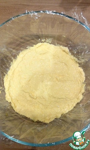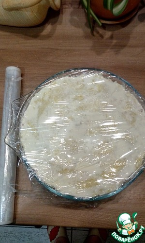 Любую милую вашему сердцу посуду застилаем пищевой пленкой. У меня обычная стеклянная жаропрочная кастрюля.