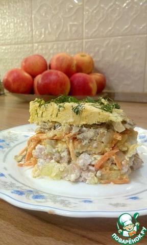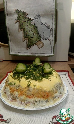 В поисках чего-нибудь новенького и необычного для новогоднего стола на просторах интернета нашла этот рецепт. Немного переделала его под наши вкусы. Название незатейливое, потому что для меня он новый, приготовлен впервые на Новый год. Может наши вкусы совпадут еще с кем нибудь и салат приживется. Рецепт трудоемкий, но получилось вкусно. И в принципе можно есть как гарнир к горячему. Он сытный и самодостаточный.