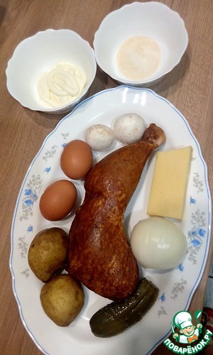 Окорочок разбираем на филе, шкурку удаляем, мелко нарезаем. Это наш шестой слой. Заключительный слой - натертый на крупной терке картофель, перемешанный с майонезом.
