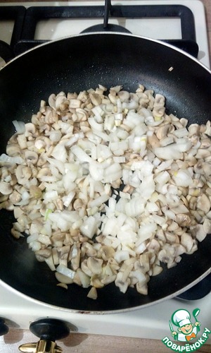 Шампиньоны не моем, просто внимательно просматриваем и при необходимости аккуратно ножом убираем землю. Лук и грибы режем кубиком. Отправляем грибы на сковороду. Когда жидкость выпарится добавляем лук, жарим до готовности, ждем, когда остынет