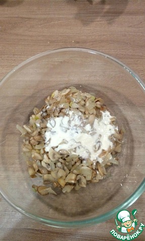 Вторым слоем выкладываем грибы с луком, заправленные майонезом.