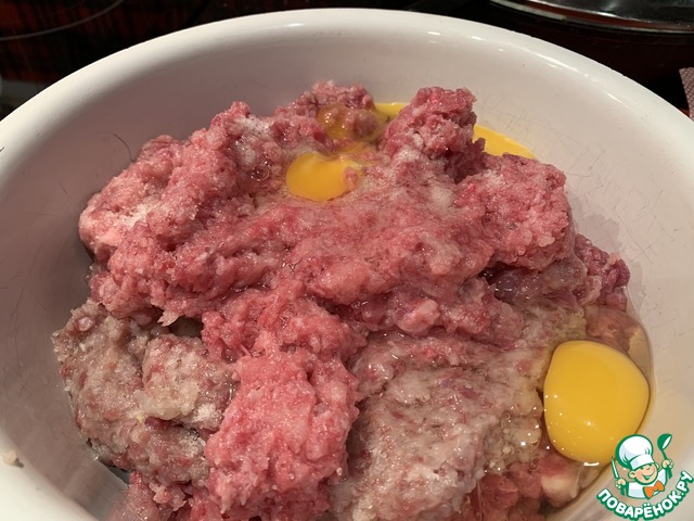 Выложите фарш в миску, добавьте яйца, соль, перец и хорошо перемешайте. Слегка отбейте фарш.