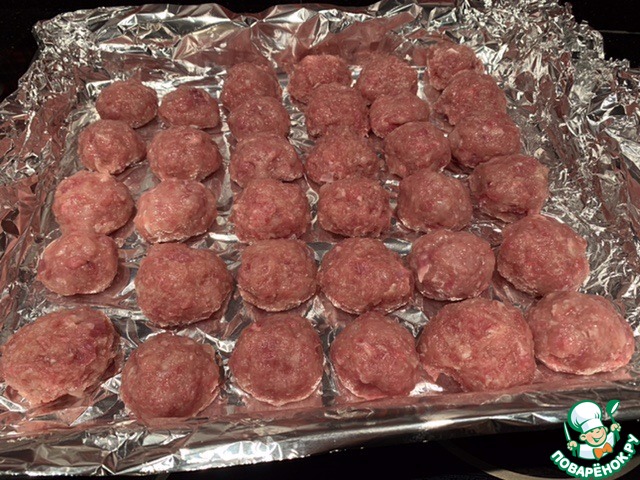 Застелите противень фольгой. Из фарша сформируйте небольшие фрикадельки, размером с грецкий орех. Выложите на противень.