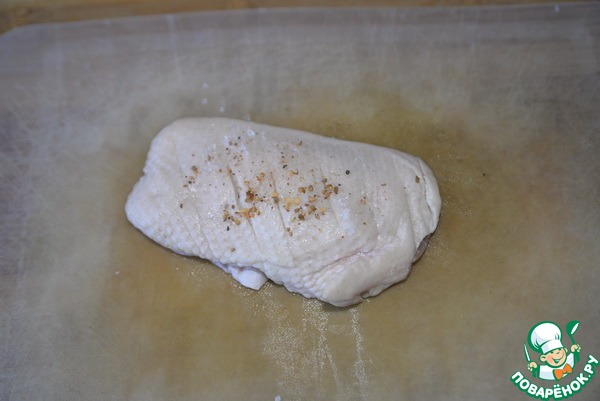 Грудку утки моем, обсушиваем, делаем продольные надрезы, не задевая мясо. Натираем солью и свеже-молотой смесью перцев.