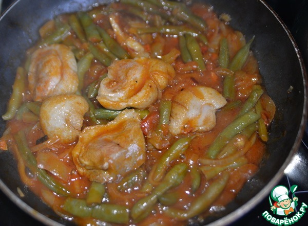 На сковороду с утиным жиром кладём лук, обжариваем 2 минуты до прозрачности, добавляем стручковую фасоль. Перемешиваем. Тушим на среднем огне 5 минут.