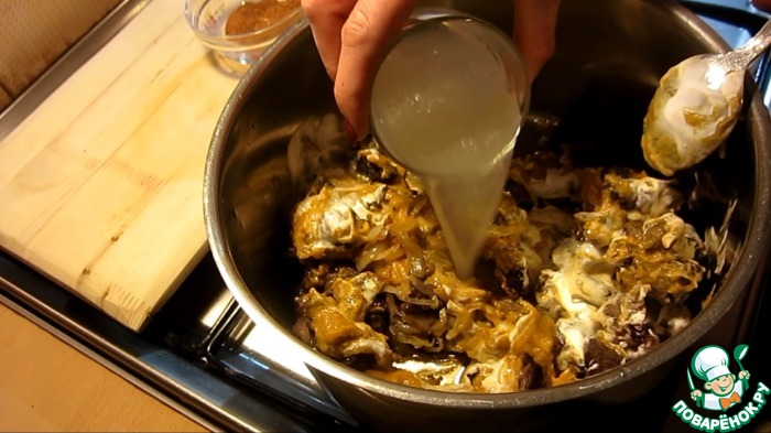Добавляем кабачковую икру и сметану. Вливаем бульон.