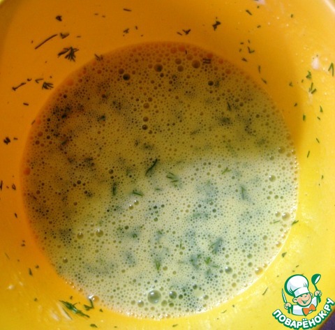 • Соединяем в удобной для взбивания посуде яйца, мелко нарезанную зелень (у меня укроп), сметану. Приправляем солью и черным перцем по вкусу.