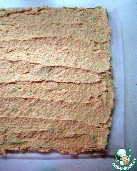 • Аккуратно сворачиваем рулет, отделяя пергамент. Затем заворачиваем его в пищевую пленку и отправляем в холодильник минимум на 2 часа. Затем нарезаем кусочками и подаем к столу!