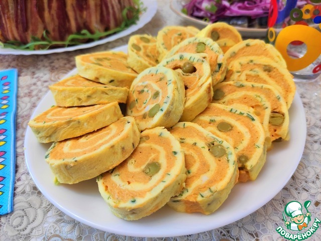 Симпатичный закусочный яичный рулет с яркой начинкой из слабосоленой сельди, моркови, горошка и плавленого сыра для разнообразия закусок к праздничному столу!