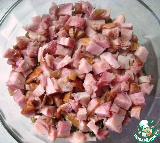Копченое мясо с куриного окорочка нарезать небольшими кусочками. -