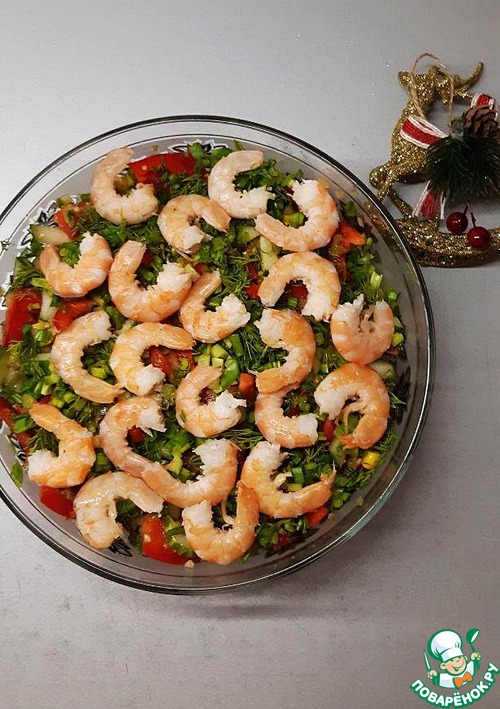 Креветки отварить в течение 2 минут, освободить от панцирей, выложить в салат. Также можно использовать консервированные креветки.