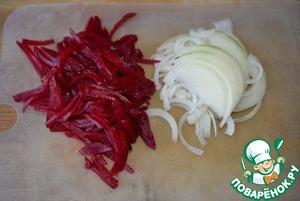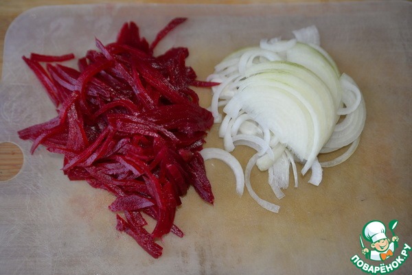 Вареную свеклу режем тонкими полосками. Лук тонкими полукольцами или полосками. -