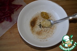 Готовим маринад. Смешиваем уксус, мёд, смесь перцев, кориандр, горчицу. Соль не понадобится, так как салат с сельдью.