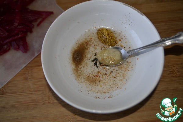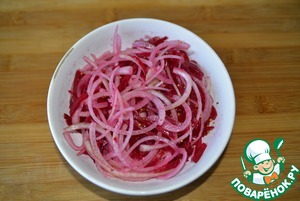 Заливаем маринадом порезанные свеклу и лук, перемешиваем, отставляем на 1 час.