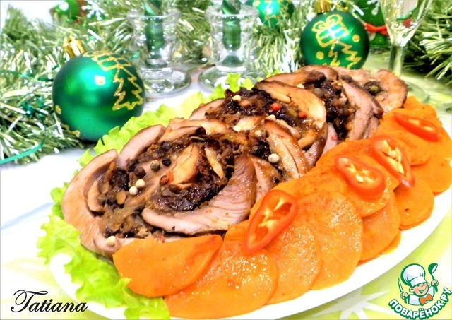 Рулет из бедра индейки, фаршированный пряной начинкой-вкусная и красивая закуска на любой случай. Мясной рулет всегда смотрится ярко и презентабельно на любом праздничном столе. Такой рулет можно подавать как в горячем, так и в охлаждённом виде. Нежное, сочное мясо индейки, пропитанное ароматами чернослива и пикантных специй. Дополнить рулет из индейки, можно полезным и ярким гарниром из имбирной моркови. В общем и целом, блюдо получается лёгкое (по составу), яркое и праздничное!
