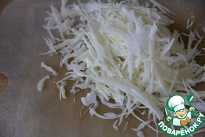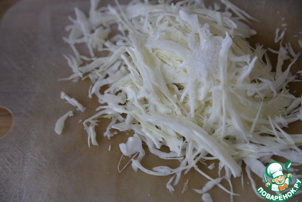 Тонко шинкуем капусту, слегка перетираем с солью и сахаром.