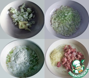 На сковороду выкладываем сливочное масло и лук, обжариваем лук 5 минут, добавляем нарезанный сельдерей и томим на малом огне ещё 5 минут. Просеиваем в сковороду муку и вливаем молоко, тщательно размешиваем смесь венчиком, варим до загустения 5 минут. Добавляем тунец и половину натертого сыра