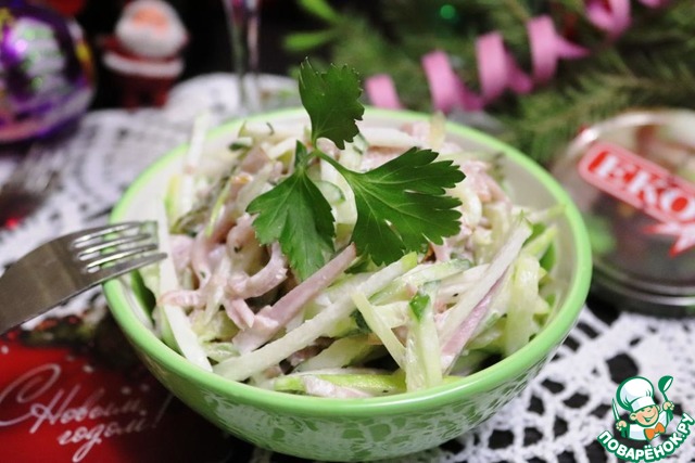 Настоящий зимний салат! Сытный из-за наличия мясных деликатесов, сочный и хрустящий из-за огурчиков, а груша добавляет пикантности и свежести. Очень вкусный!