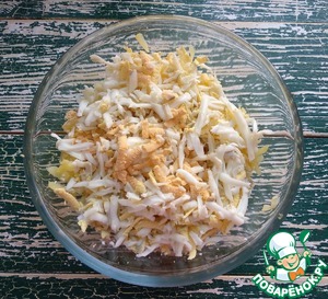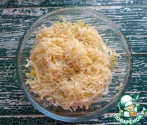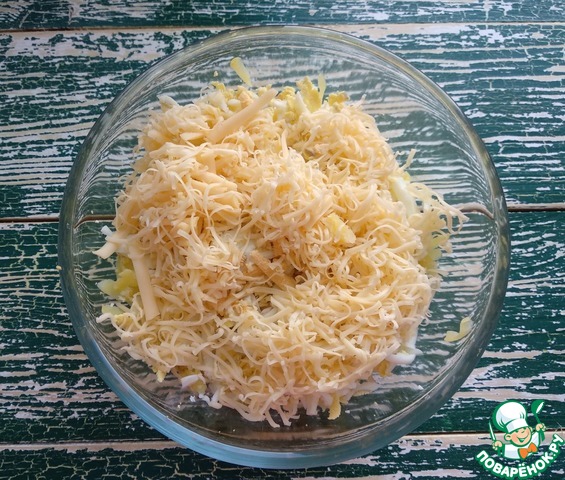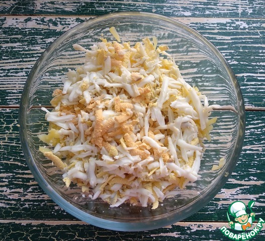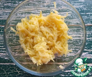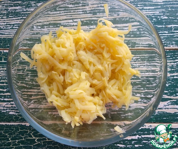 Картофель отварить в мундире. Почистить и натереть на крупной тёрке.