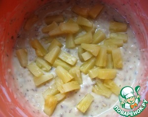 Добавить кусочки ананаса (предварительно вынуть их из банки, дать стечь сиропу). Аккуратно перемешать тесто.