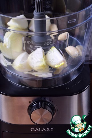 Первым делом нужно приготовить маринад для свинины. В этом мне поможет кухонный комбайн GALAXY GL2300. Я использую функцию измельчения продуктов, скорость "1".