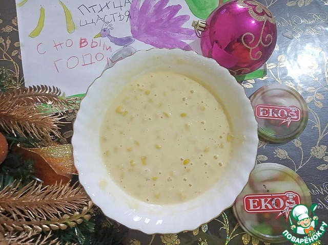 • Добавляем к молоку промытую и обсушенную консервированную ЕКО-кукурузу и перемешиваем.