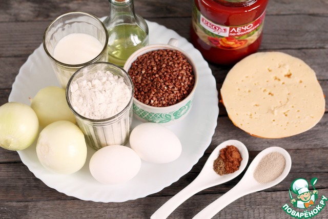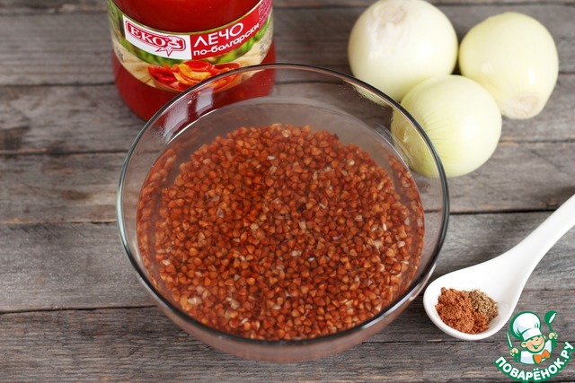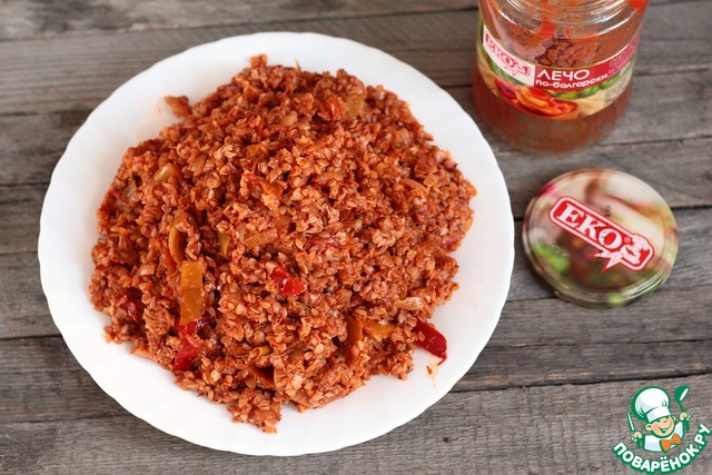 В предварительно разогретой с небольшим количеством оливкового масла сковороде поджарить подготовленный лук. Выложить гречневую крупу и соус "Лечо по-болгарски" ТМ "ЕКО", добавить молотые орех мускатный и кориандр, тщательно перемешать. Готовить в течение 5 минут, не забывая перемешивать. Перед формованием галет начинку обязательно остудить.