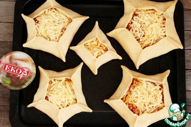 Каждый "колобок" раскатать в круглый сочень толщиной 2 мм. Плотно выложить начинку, но столько, чтобы не было трудностей с формованием. Сверху выложить немного сыра. (Пятую часть его объема оставить для подачи.)