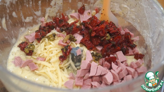 Добавить в тесто сыр, сосиски, мелкопорезанные помидоры, можно оливки колечками.