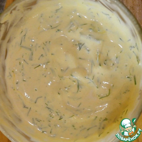 Приготовить соус: смешать сметану, горчицу, мелко нарезанный укроп и соль.