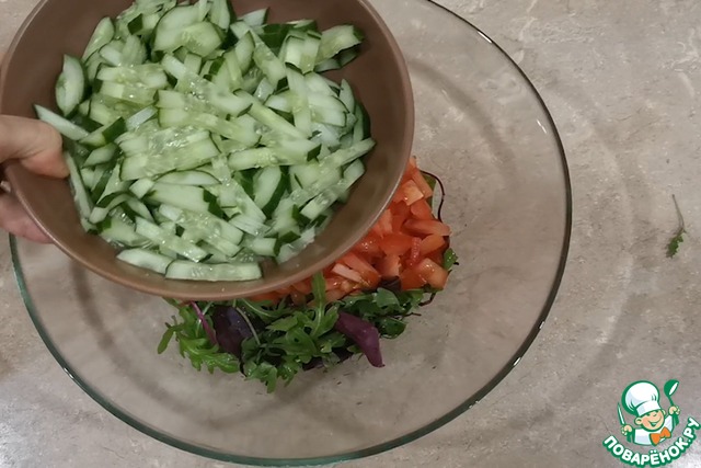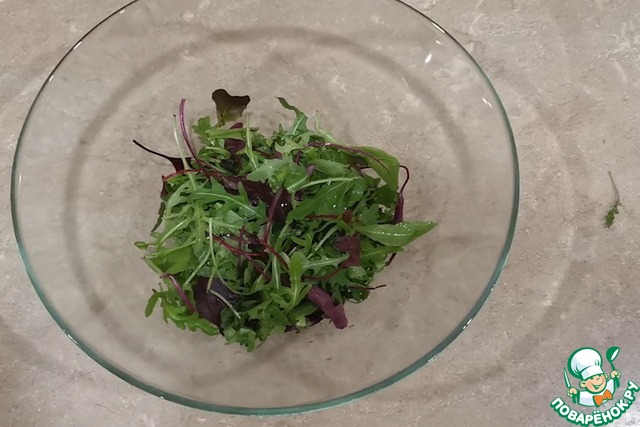 Выкладываем в глубокую миску смесь листьев салата
