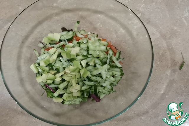 Свежие огурцы нарезаем мелко брусочками и также добавляем в миску.
