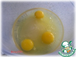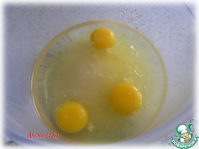 Смешать 100 г сахара, 1 ч. л. соли, 150 мл растительного масла и 3 яйца до однородности.