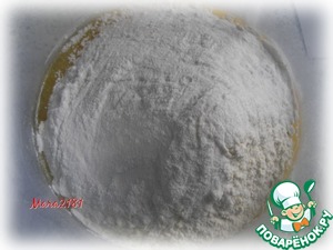 Просеять 160 г пшеничной муки и 75 г рисовой муки, перемешать и добавить к яичной смеси.
