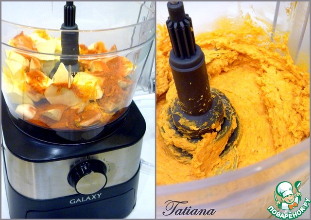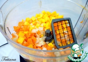 В чашу кухонного комбайна установите насадку для нарезки кубиками, измельчите очищенные овощи :тыкву, морковь и лук.