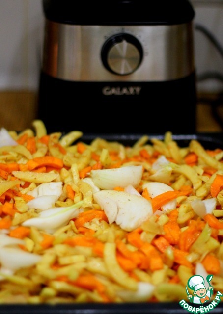 Когда овощи будут почти готовы нужно посыпать их солью (специи по желанию). Перемешать, полить маслом, и снова перемешать. Запечь до готовности.