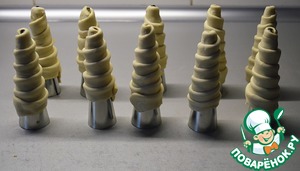 Алюминиевые формочки смазать маслом. Полоски теста сложить вдоль вдвое, накрутить с захватом на подготовленные конусы.
