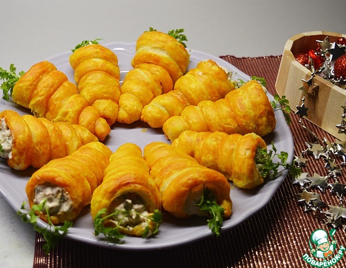 Очень симпатичная и вкусная закуска в виде морковок из слоёного теста с кремом из тунца и творожного сыра.
