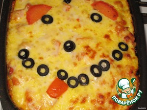 Смазать верх смесью из кетчупа, сметаны и майонеза и отправить в духовку на 30-35 минут при 180 С.