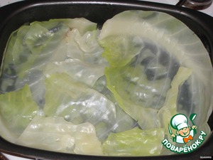 На дно выложить один слой капустных листьев внахлест друг на друга.