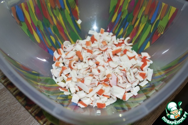 2. Нарежьте крабовые палочки средними кусочками, чтобы не получилось слишком мелко, поместите в миску.