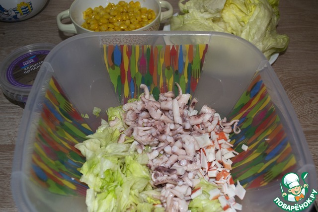 1. Основной вкус нашей закуске дают морепродукты, поэтому именно их необходимо выбирать только качественные и отборные. Покупаю «Лунское море» потому что давно доверяю их качеству и вкусу. Салат нужно выбирать без потемневших листьев.