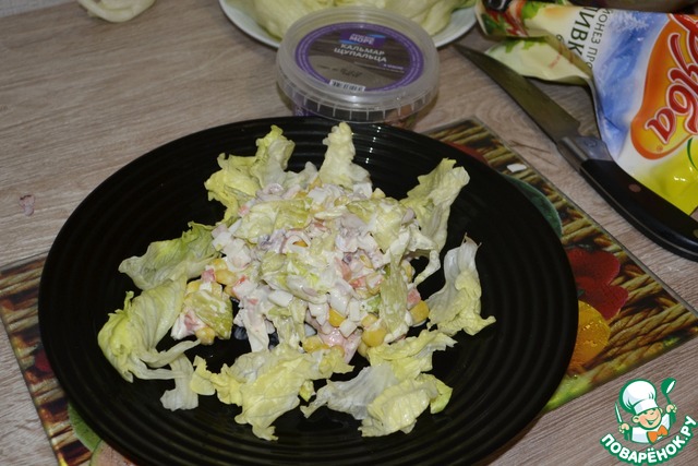 3. Затем нарежьте листья салата, так же средними ломтиками и добавьте к крабовым палочкам.