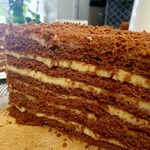 [+5]О процессе (может быть кому-то будет полезной информацией). Готовила тесто 2/3 от указанной нормы, коржи 18 см диаметром, вышло 12 шт, обрезки пошли на крошку. Муки ушло чуть больше и ещё на подпыл для раскатки. Крем увеличила, к 500 мл молока добавила 100-150 мл 10% сливок и крахмала взяла 50 г, масла не увеличивала. И всё-таки крема хотелось бы побольше. Глазурь тоже 2/3 ч. с лихвой хватило и на верх, и на бока торта.