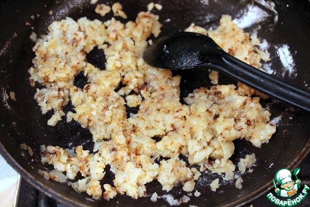 Измельченный лук пассеровать до мягкости. Добавить муку и обжаривать помешивая 2 минуты.