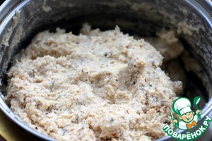 Грудку соединить с соусом, перемешать, если будет жидковато, то добавить панировочных сухарей в массу, посолить, поперчить.