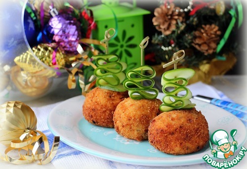 На праздничном столе прекрасной закуской будут сочные и нежные крокеты, украшеные огуречной ёлочкой.