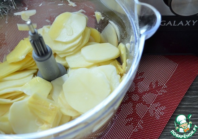 Картофель почистить, нарезать тонкими слайсами в комбайне.