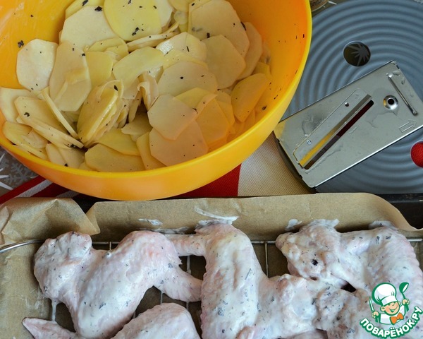 слайсы картофеля посолить, выложить в маринад от крыльев, перемешать. -