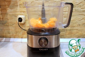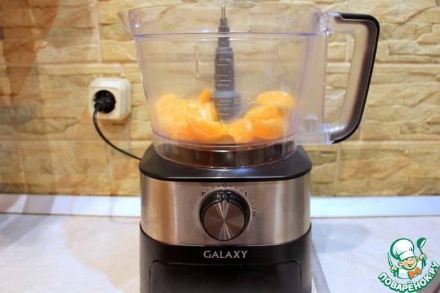 Мандарин измельчить в комбайне GALAXY GL2300 с помощью ножа измельчителя в однородную массу. Импульсами в микроволновой печи растопить желатин, только не кипятить.